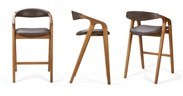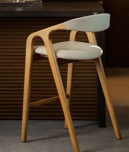 Banqueta Alma Luhaz, fabricada em madeira com linhas curvas.